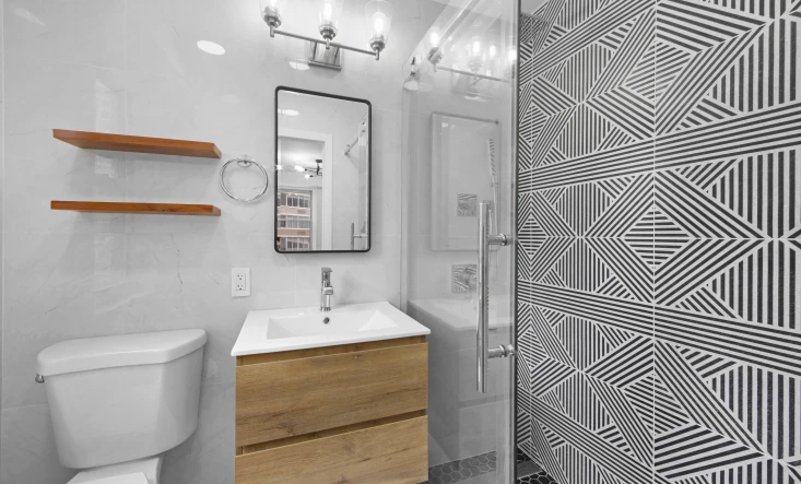 Bathroom remodel included converting the tub to a shower, installing a modern wall-mounted vanity, and replacing all fixtures. The shower area showcased an accent black & white Astoria wall tile, perfectly complemented by the subtle stone-looking Aria Ice porcelain tile on the floors and walls in the rest of the bathroom.
